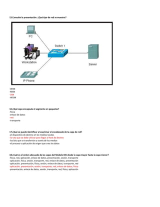 Ad Unlimited Access To Free Online Courses. Una empresa está contemplando la posibilidad de utilizar una red de cliente-servidor o una red entre pares. Un administrador de redes introduce el comando copy running-config startup-config. Preguntas y Respuestas - 1010. About Press Copyright Contact us Creators Advertise Developers Terms Privacy Policy Safety How YouTube works Test new features Press Copyright Contact us Creators. Full PDF Package Download Full PDF Package.